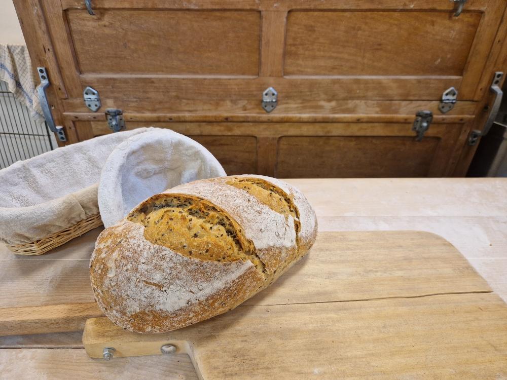 Pain aux graines de colza et de lin, au levain, cuit sur sole, dans un four à bois