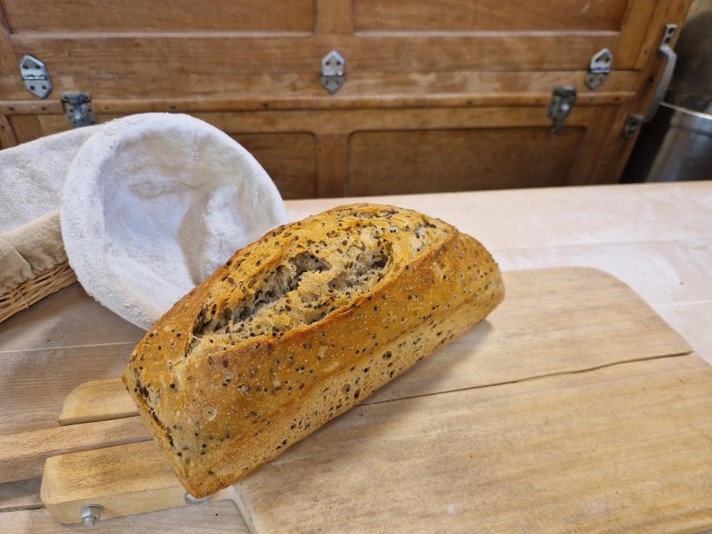 Pain aux graines de colza et de lin, au levain, cuit dans un moule, dans un four à bois