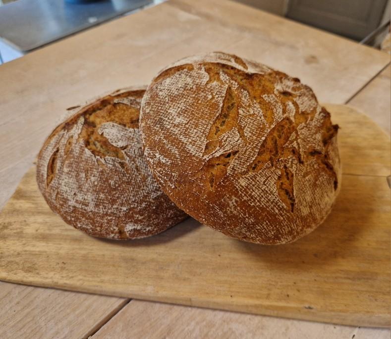 Pain au levain naturel composé de 3 farines: blé (80%), orge (11%), seigle (9%) . Boule cuite sur sole, dans un four à bois